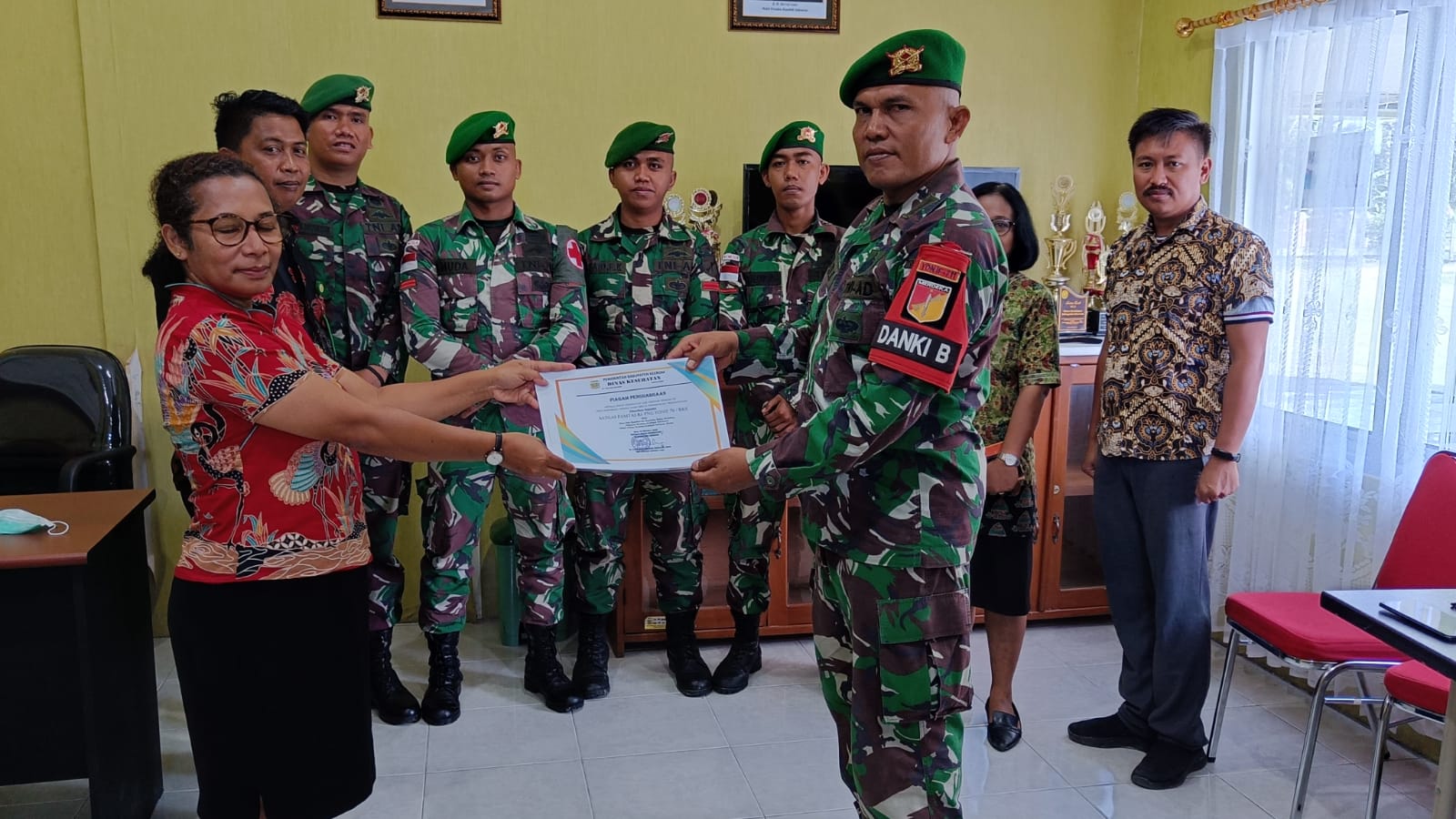 SALIRA TV KEEROM – PAPUA – Atas keberhasilan mewujudkan pelayanan kesehatan diperbatasan RI-PNG, Satgas Pamtas RI-PNG Yonif 711/Rks Brigif 22/OM menerima penghargaan dari Dinas Kesehatan Kabupaten Keerom, di kantor Dinas Kesehatan, Distrik Arso Timur, Kabupaten Keerom, Papua, Kamis (20/10/2022).