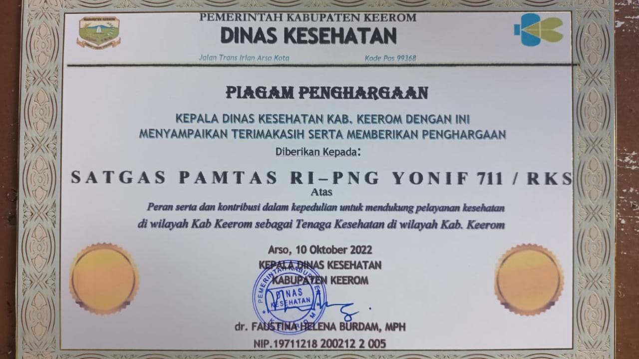 Partisipasi Aktif, Satgas Pamtas Yonif 711/Rks Terima Penghargaan Dari Dinas Kesehatan Kabupaten Keerom