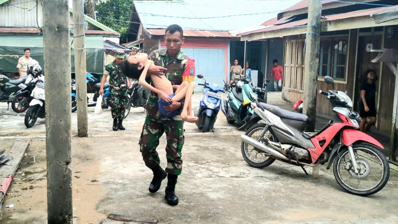 SALIRA TV BUTOK – KALIMANTAN TENGAH (13/11/2022) – Seorang Babinsa yang terlihat sedang membopong seorang anak dalam keadaan sakit dan selama 8 Tahun berbaring di dalam rumah yang bertempat di Jalan Karau Gang Swarga Kecamatan Dusun Selatan, Jumat 11 November 2022.