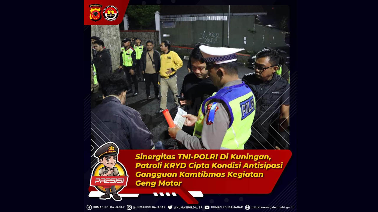 SALIRA TV KUNINGAN – Polres Kuningan Polda Jabar, Kapolres Kuningan AKBP Dhany Aryanda S.l.K., beserta jajarannya, Pada hari Jum’at 17 Februari 2023 pukul 21.20 Wib sampai dengan hari Sabtu, 18 Februari 2023 pukul 01.30 Wib bertempat diwilayah Hukum Polres Kuningan, Polda Jabar, Berdasarkan Surat Perintah Kapolres Kuningan Nomor : Sprin/192/II/OPS.4.5./2023 tanggal 17 Februari 2023 telah dilaksanakan KRYD Cipta Kondisi Antisipasi Gangguan Kamtibmas Kegiatan Geng Motor dan C3 (Curas, Curat, Curanmor).