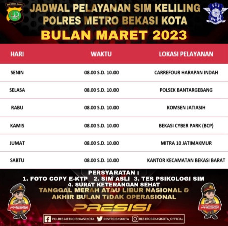 SALIRA TV BEKASI – Jadwal Pelayanan SIM Keliling Polres Metro Bekasi Kota Bulan Maret 2023