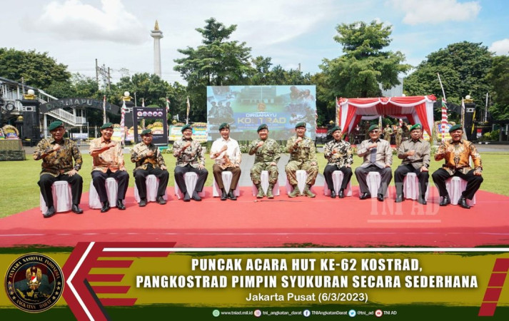 SALIRA TV JAKARTA, tniad.mil.id Panglima Kostrad Letnan Jenderal TNI Maruli Simanjuntak, M.Sc. memimpin syukuran peringatan HUT Ke-62 Kostrad tahun 2023, yang dilaksanakan secara serentak dan sederhana melalui Video Conference yang diikuti oleh seluruh jajaran Divif 1, 2 dan 3 Kostrad serta satuan yang melaksanakan penugasan, bertempat di Lapangan Upacara, Markas Kostrad, Gambir. Jakarta Pusat. Senin (6/3/2023).