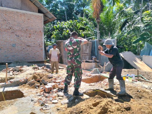 yang selalu berada tengah-tengah warga binaannya, sudah barang tentu jika di wilayahnya ada kegiatan sekecil apapun Babinsa harus terjun secara langsung untuk membantu pembuatan pondasi rumah milik Bpk Samsul Bahri di Desa Buket Kuta, Kecamatan Peudawa, Kabupaten Aceh Timur, Senin (29/05/2023).