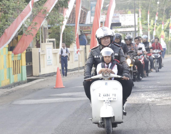 Dengan menggunakan sepeda motor vespa Kapolres Banjar bersama Kasat Lantas Polres Banjar AKP Yudiono,S.Sos.,M.M. menjemput Sandi di rumahnya kemudian mengantarnya ke sekolah.