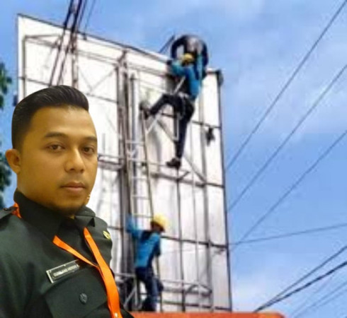 Perlengkapangan APD, seperti pelindung kepala, pelindung mata dan Body Horness tampak dipergunaakan saat melakukan pemasangan peremajaan papan reklame.