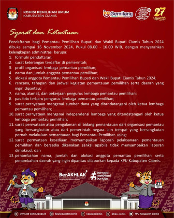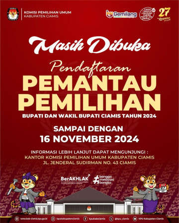 Maka Komisi pemilihan umum (KPU) Kabupaten Ciamis membuka Pendaftaran Pemantau Pemilihan Bupati dan Wakil Bupati Ciamis Tahun 2024 dibuka sampai tanggal 16 November 2024