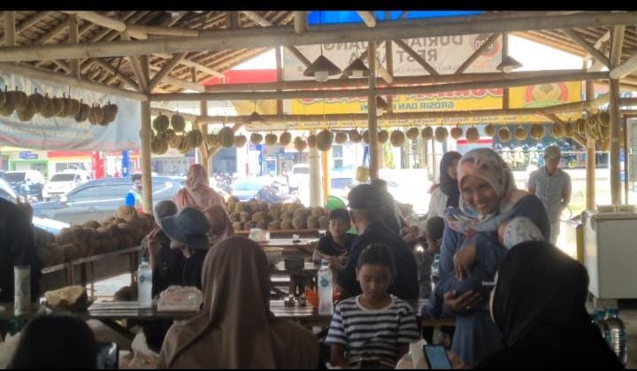 SALIRA TV KAB. CIAMIS – Cikoneng, Ciamis – Suasana meriah terlihat di sentra Kedai durian Kujang, Cikoneng, Kabupaten Ciamis pada hari ketujuh pasca-Lebaran, Senin