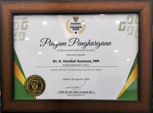 Penghargaan bergengsi tersebut diterima oleh Kepala Bagian Kesra Setda Ciamis, Ihsan Rasyad, yang hadir mewakili Bupati Herdiat. Penyerahan dilakukan langsung oleh Ketua BAZNAS RI, Prof. Dr. KH. Noor Achmad, MA, sebagai bentuk penghormatan atas kontribusi nyata Kabupaten Ciamis dalam melakukan transformasi digital pengelolaan zakat.
